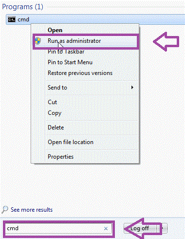 1. (Klik kanan-Type "cmd" ke dalam kotak pencarian pada cmd dan pilih "Run as administrator"..): Buka Command Prompt dengan Hak Administratif